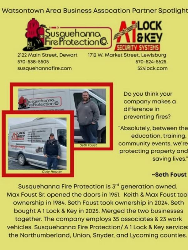 On November 10, 2025, we’re excited to announce that Susquehanna Fire Protection Company and A1 Lock & Key Security Systems in Lewisburg, Pa have officially combined forces to become the region’s leading provider of complete protection and security solutions for your business and home.